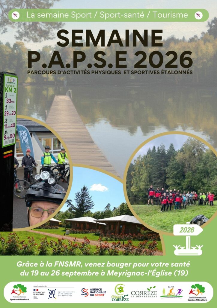 Après le succès de sa première édition, la Fédération Nationale du Sport en Milieu Rural (FNSMR) vous invite à la 2ème édition de la Semaine PAPSE (Parcours d’Activité Physique Sport Santé pour l’Équilibre). Du 19 au 26 septembre 2026, venez conjuguer sport bien-être, convivialité et découverte du patrimoine au cœur de la Corrèze.